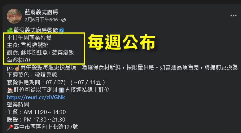 最近在網路上熱議的就是他們的「平日商業午餐370元」只限週一到週五中午提供,每週日會在他們的粉專公布下週的菜單,有雞腿排、豬排,也有出現過牛排,很多人都是衝著平日商業午餐去的喔~