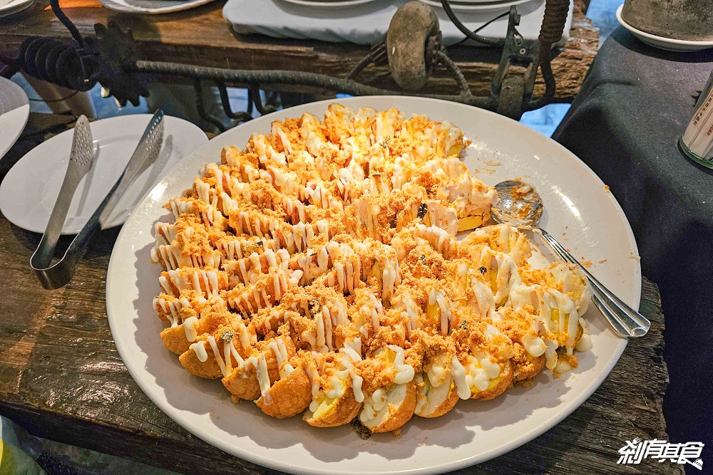 這是炸過的蛋料理,再淋上沙拉醬及香鬆,偏台式但很好吃,一下子就被拿光了😆