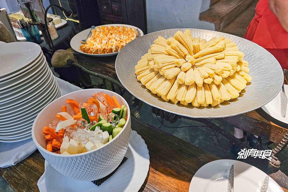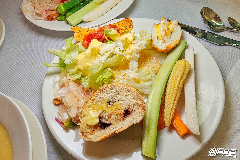 生菜很新鮮,旁邊的「紅蘿蔔、小黃瓜、馬蹄(荸薺)」弄成條狀,還有玉米筍、玉米等,沙拉醬有千島醬、優酪醬、和風醬…等可選。