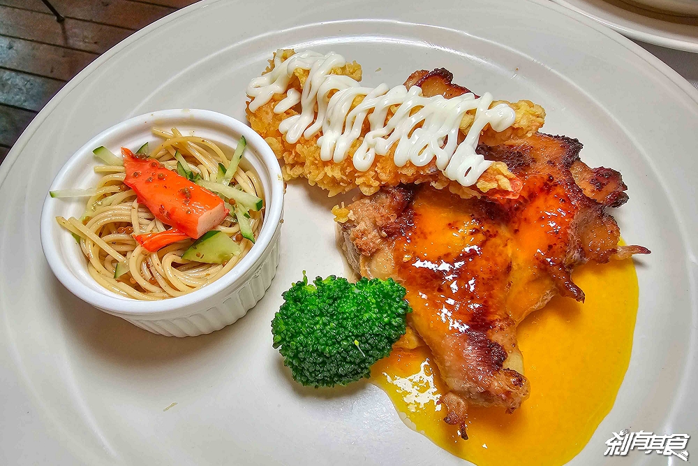 「香橙雞腿排」烤到外酥內嫩,切開還有肉汁流下來,甜甜帶點微酸的香橙醬汁吃起來很開胃又解膩。