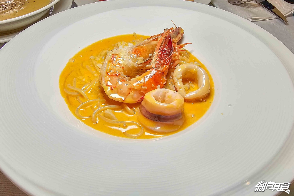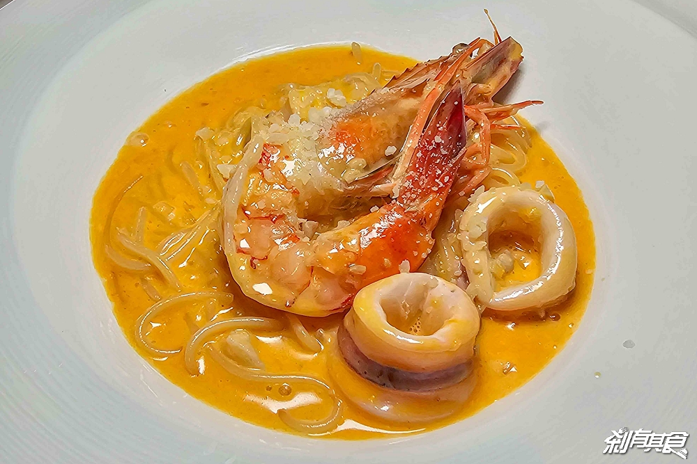 「毒癮海鮮麵」的醬汁帶有微辣的番茄基底,並融合了海鮮的鮮味與香料的層次感,我得到的小道消息是裡面還放了紹興酒,多了一股特別的酒香味 (但不會醉請放心)。