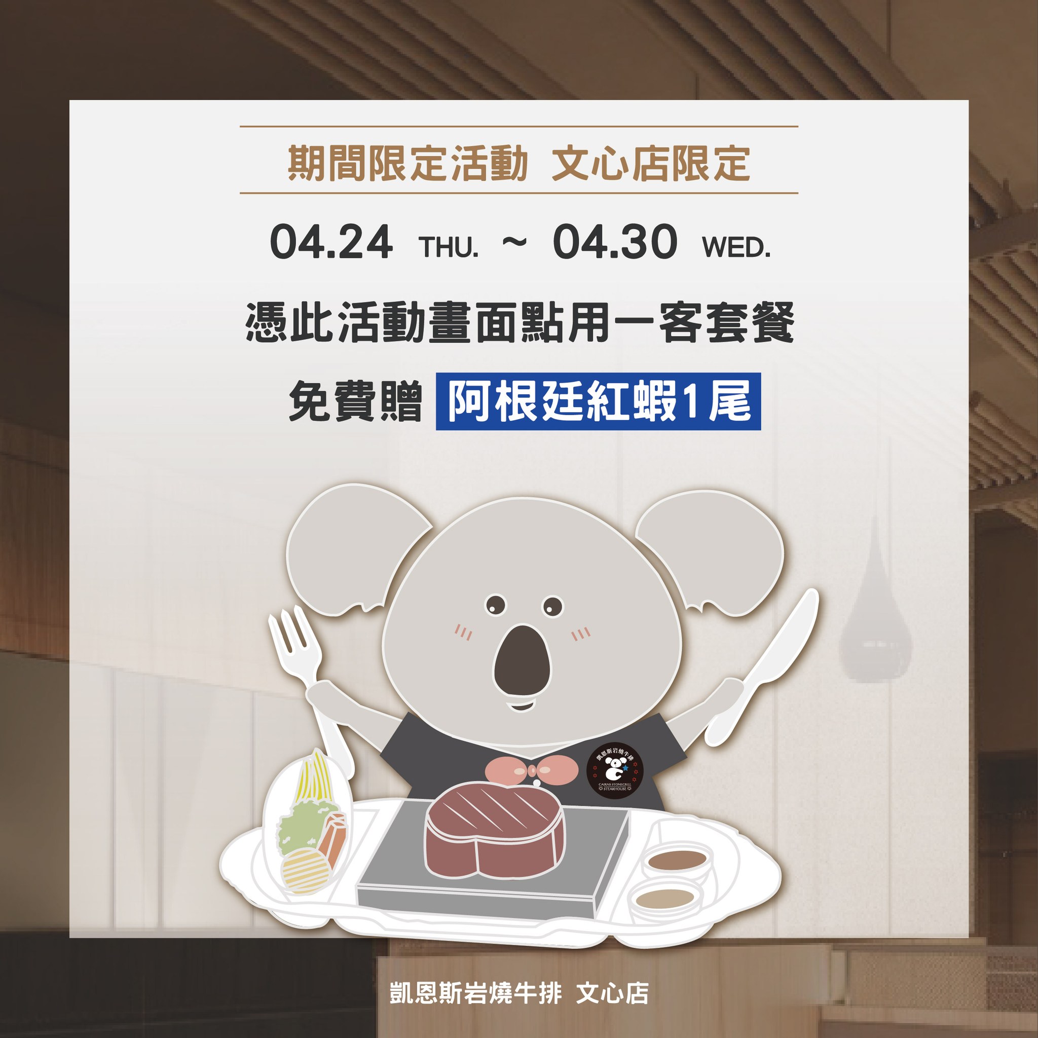 「凱恩斯岩燒牛排文心店」已於官網公告 4/24試營運,4/24-4/30 點用一客套餐並出示上圖就可以獲得「阿根廷紅蝦 1尾」