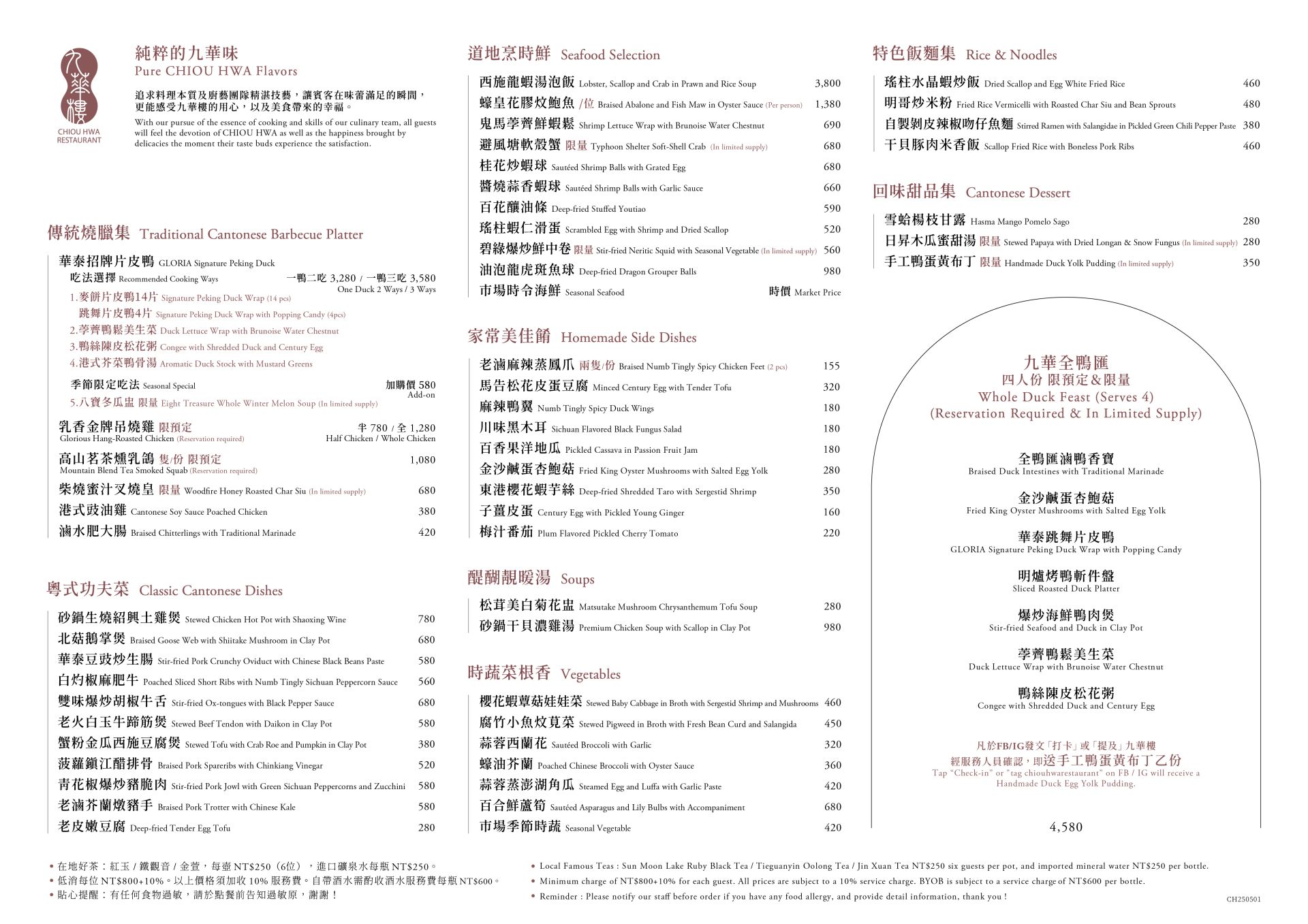 華泰片皮鴨(粵式烤鴨)是九華樓的鎮店之寶,選用優質北京鴨,經過繁複的工序烤製而成,皮酥肉嫩,油亮誘人。有多種吃法,如搭配全麥餅皮、甜麵醬、蔥段、小黃瓜和獨家甜薑片的傳統吃法,以及搭配跳跳糖的創新吃法。