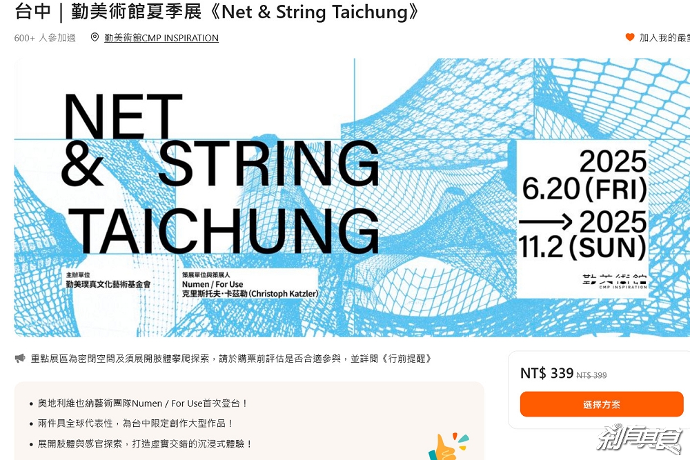 台中展覽+1 勤美術館 最新「勤美術館2025夏季展」來了,邀請來自奧地利維也納、活躍於概念藝術與空間實驗領域的設計團體 Numen / For Use 首度來台展出,推出台中限定版本《Net & String Taichung》,6公尺高的充氣結構裝置裡有大型立體攀爬迷宮,還有繩索編織出三維線性空間,非常好玩又好拍,附上85折購票連結,大家快一起來看看吧~