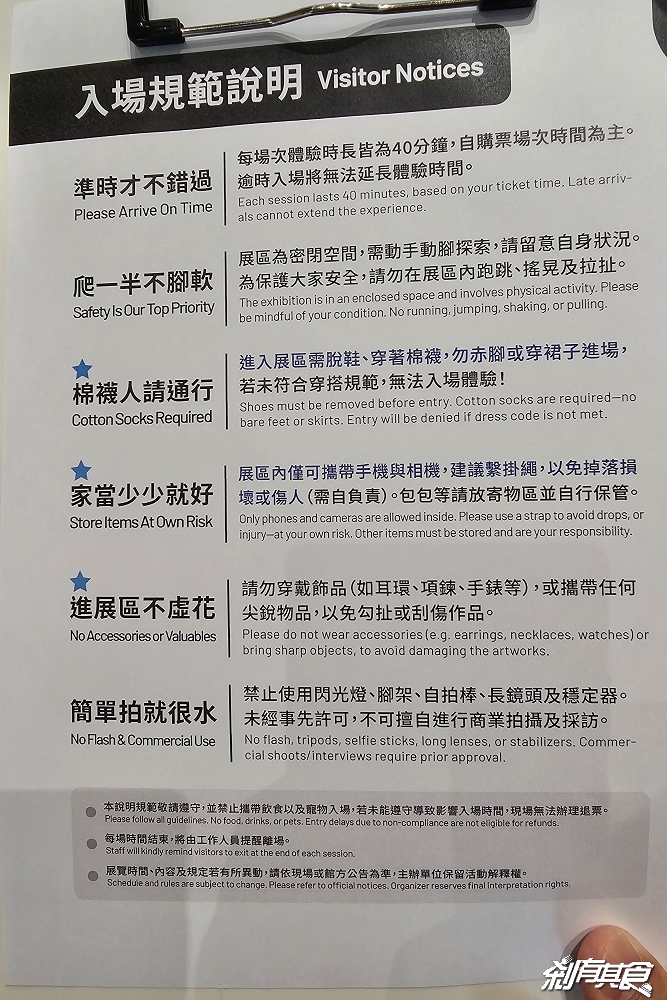 2.進入展區需脫鞋,請務必穿著棉質襪子及穿著便於活動的服裝,勿赤腳或穿著裙子入場(其他材質襪子須另加穿棉襪入場)。