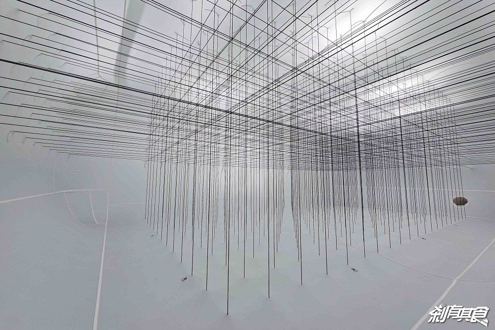 《String Taichung》是以緊繃的繩索編織出三維線性空間,靈感來自館體屋頂的斜線格柵。看起來有點像3D列印設計,但其實是他們純手工打造的,模擬數位美學的嘗試。