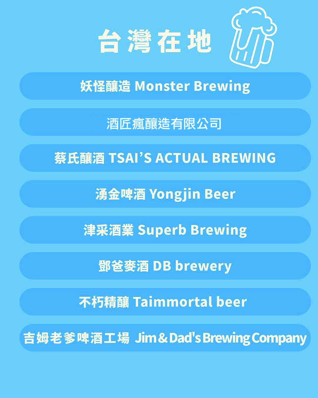 有14款精釀啤酒可選擇,有烏鶖啤酒、心流釀造、禾樂精釀、掌門精釀、福爾摩沙精釀、自由人釀造、臺虎精釀、23號精釀、Fremont,很多款都是市集限定,其他地方喝不到的喔👍