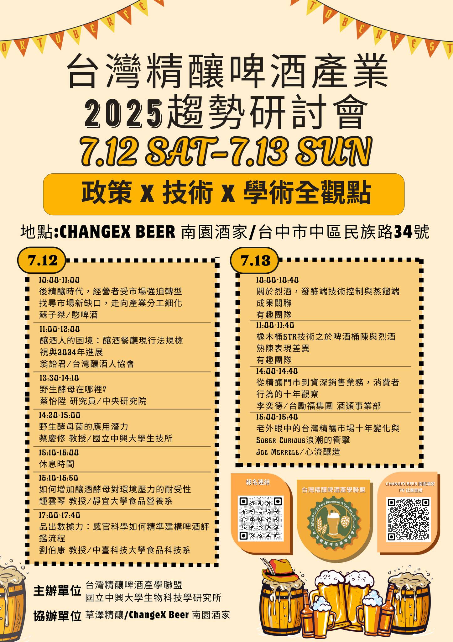 ChangeX Beer精釀啤酒節 延續去年慣例,邀請國立中興大學團隊「台灣精釀啤酒產業趨勢研討會」移師「ChangeX Beer南園酒家」舉行為期兩天的研討會,精釀啤酒不只是風味的展演,更是產業未來的縮影。誠摯邀請您一同參與這場聚焦產官學交流的深度對話。名額有限、免費參加,歡迎手刀報名參加!