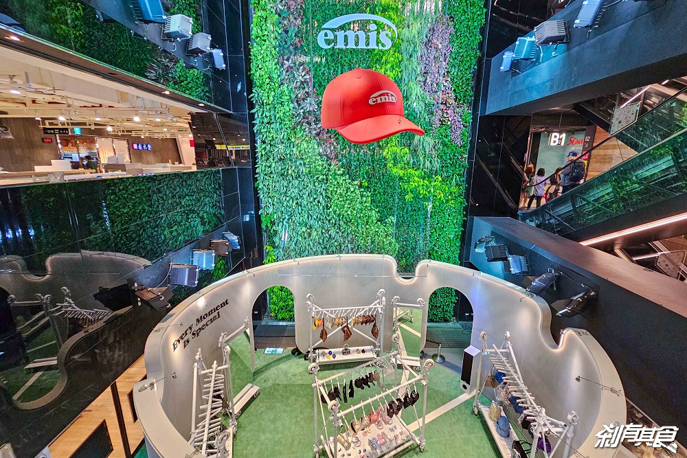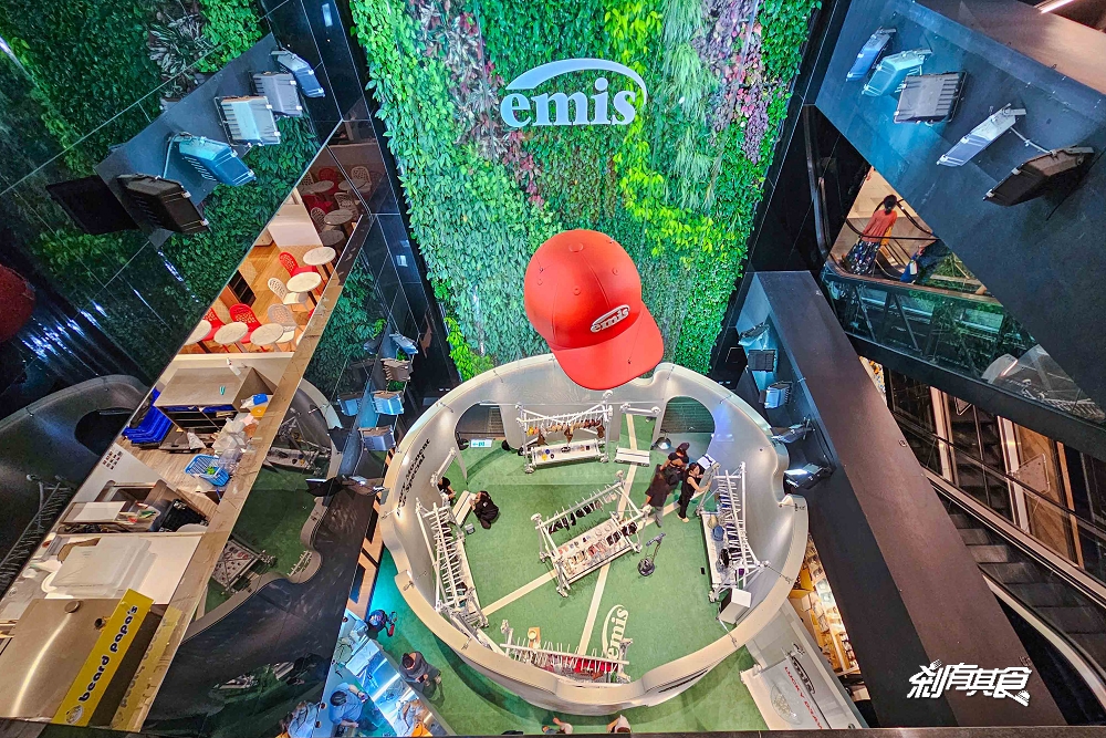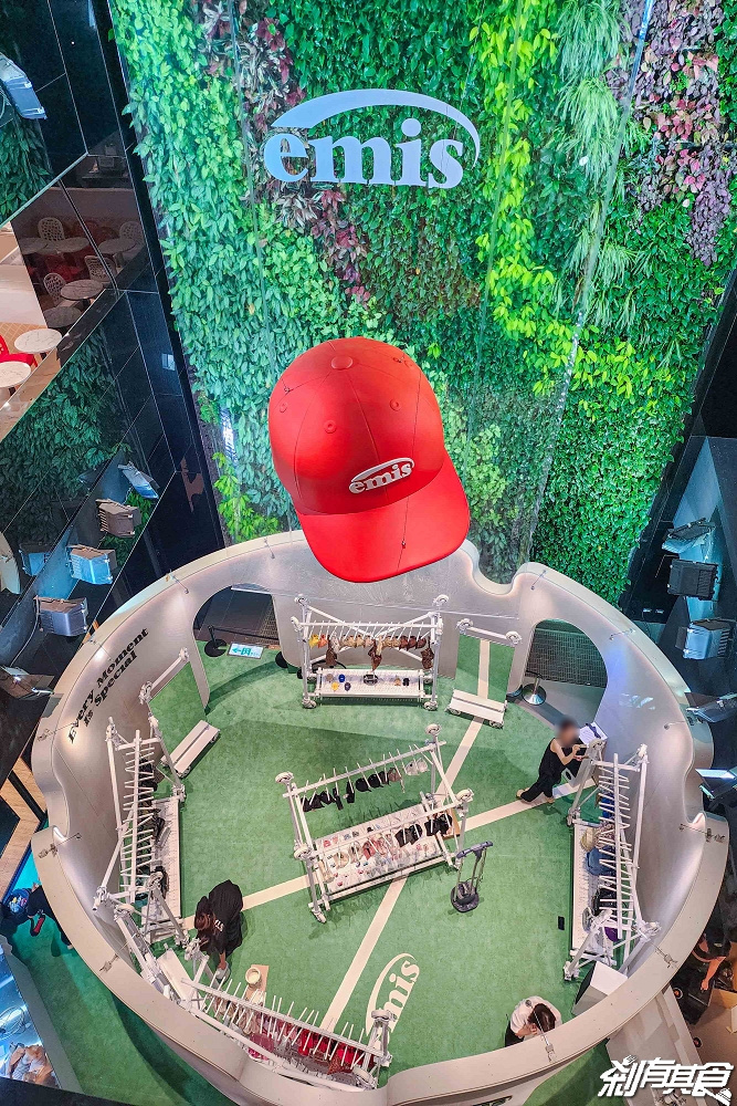 EMIS台中店」就在台中勤美誠品綠園道 B2,從一樓往下看就可以看到一頂超巨大的紅色帽子,就是它啦! EMIS的 logo也高掛在上面、非常醒目,想要不看到也難~