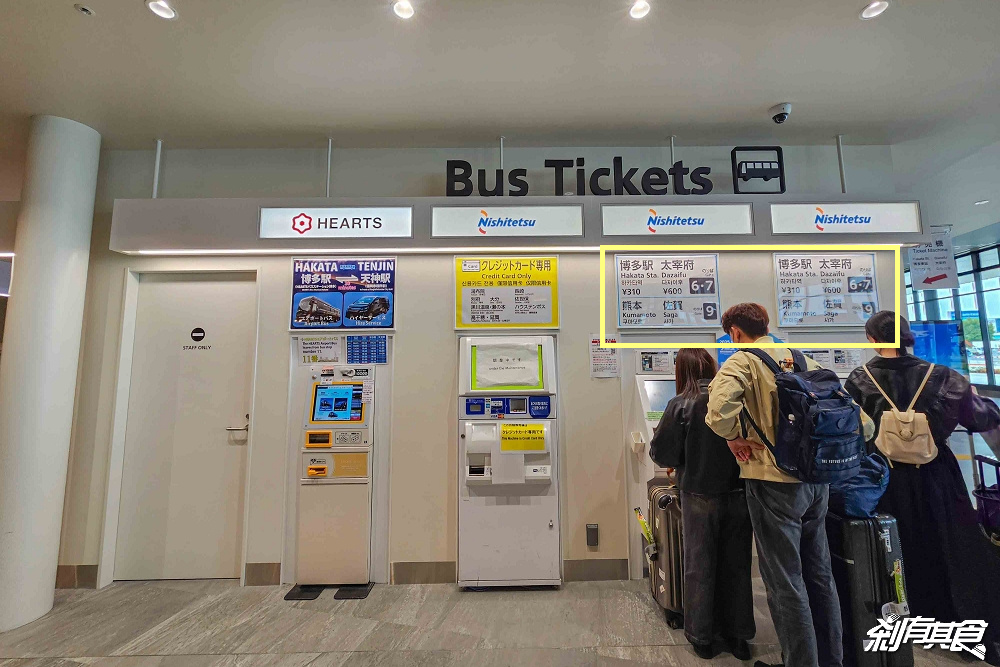 往前走是 西鐵巴士 的購票機,上面有清楚的標示要往「博多站、太宰府」要到 6-7號乘車處,往「熊本、佐賀」要到 9號乘車處。