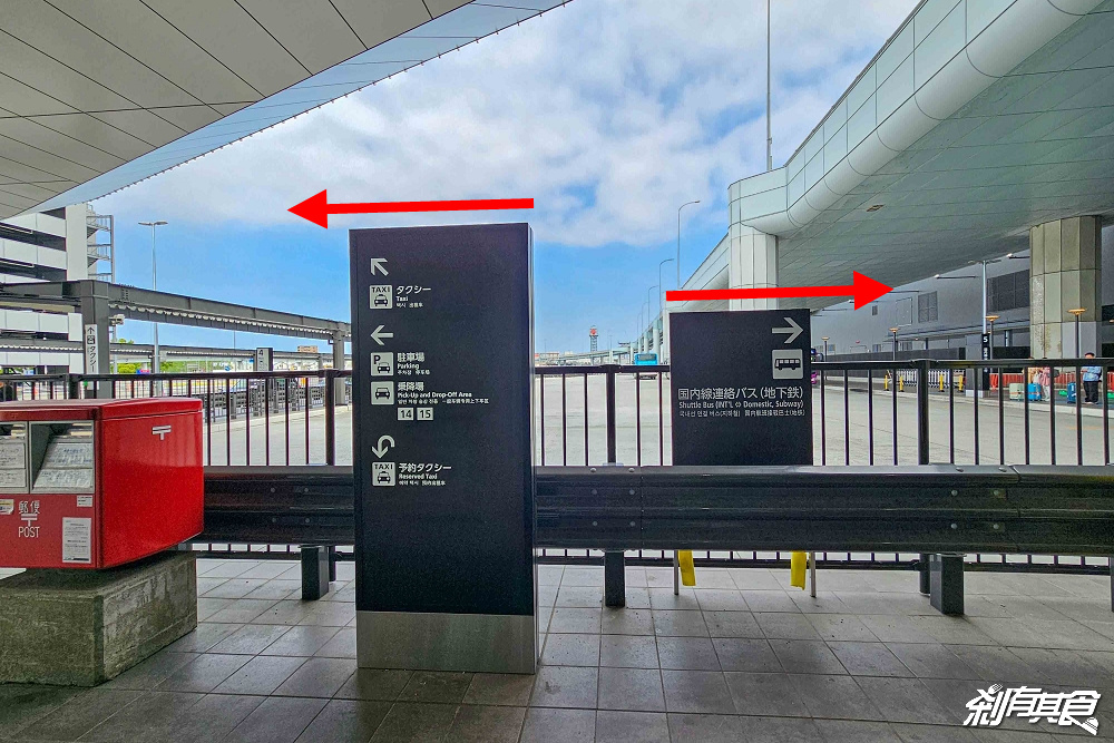 從「A3門」出去之後會看到這個指示牌,左邊是去搭計程車、或是預約私人接送的停車場,我們要往右邊走才是 「免費航廈接駁巴士」的乘車處。