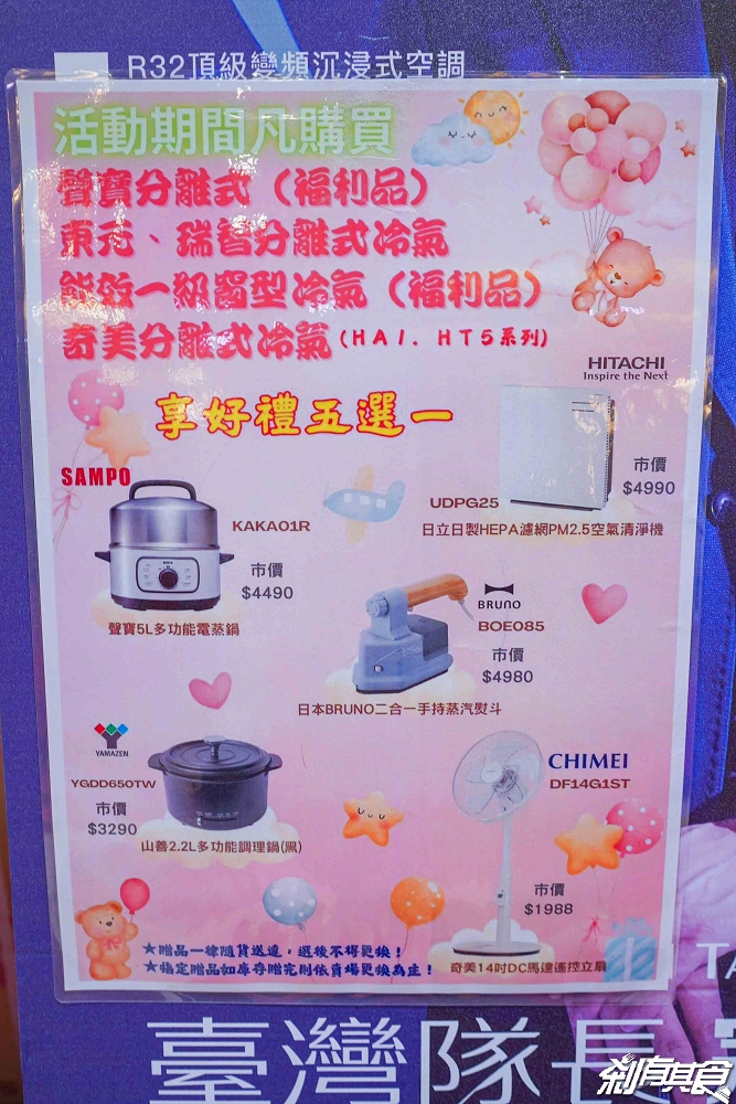 買「聲寶福利品分離式(福利品)、東元、瑞智分離式冷氣、一級能校窗型、奇美分離式冷氣」即享好禮5選1,我看到獎品嘴巴都快被嚇掉了,有奇美14吋搖控DC立扇 (市價1980元),還有「日立HEPA濾網空氣清淨機 (市價4990元)、山善2.2L多功能調理鍋 (市價3290元)、BRUNO 2合1手持蒸汽掛燙機 (市價4980元)、聲寶5L多功能電蒸鍋 (市價44900元)」,真的買到賺到!