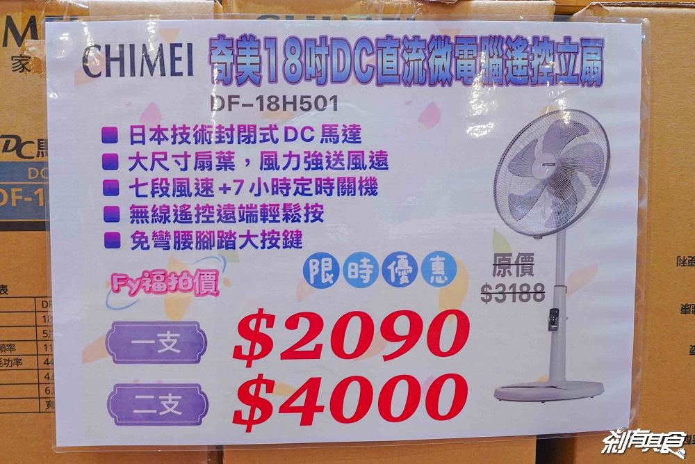 「奇美 18吋DC直流微電腦遙控立扇」原價 3188元,fy福拍價 2090元,兩支 4000元,現省 2376元。