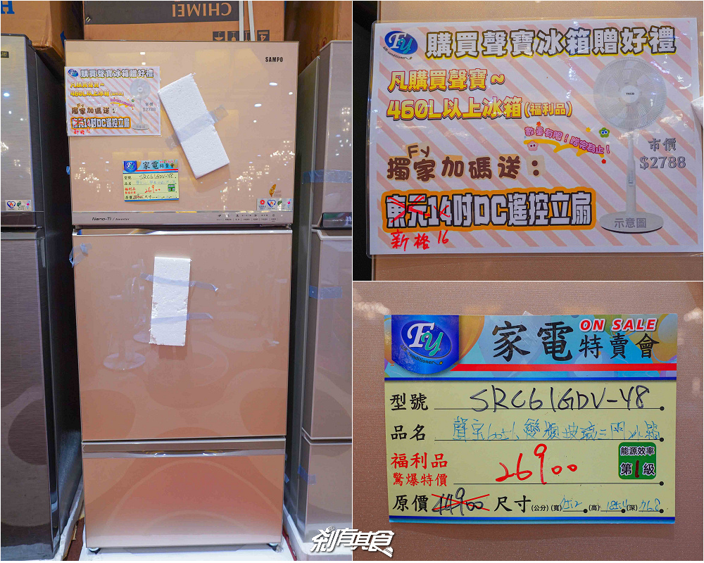 「聲寶 605L變頻玻璃三門冰箱」原價 44900元,福利品驚爆特價只要 26900,現省18000元,還加碼送新格16吋DC遙控立扇(市價2788元),真是太殺了!