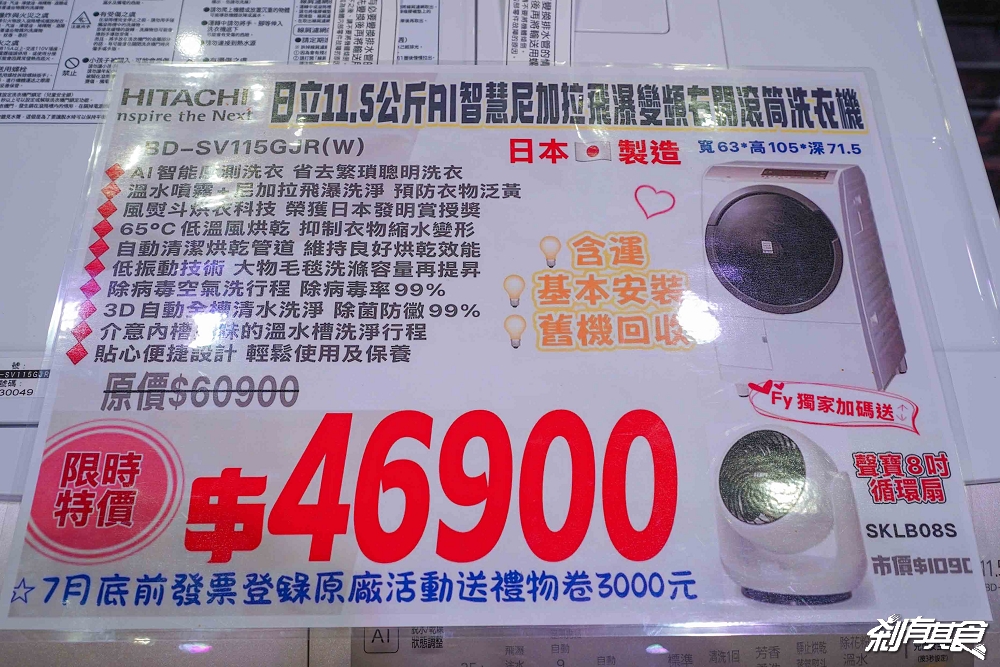 最有看頭就這台日本製造「日立11.5公斤 AI智慧尼咖拉飛瀑變頻右開滾筒洗衣機」,之前是需要預購,現在有現貨了!原價 60900元,限時特價只要 46900元,現省 14000元 (含運、基本安裝及舊機回收),Fy加碼送聲寶8吋循環扇 (市價1090元),7月底前發票登錄原廠活動送禮物券3000元,看得我好想買~~