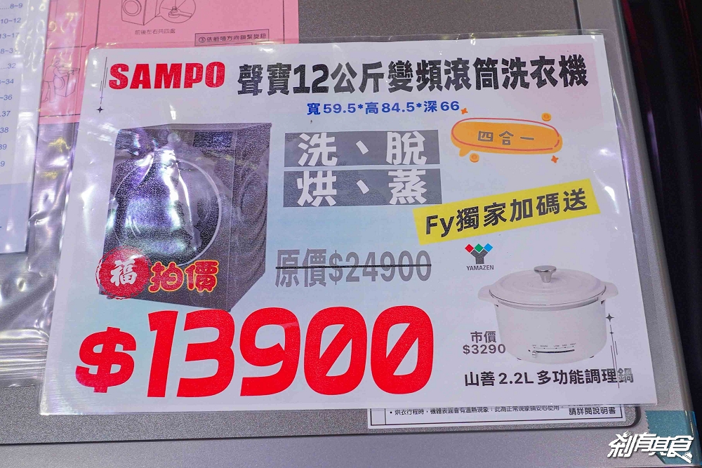 「聲寶12公斤 變頻滾筒洗衣機」原價 24900元,福拍價只要13900元,現省 11000元,fy獨家加碼送「山善2.2L多功能調理鍋 (市價3290元)」