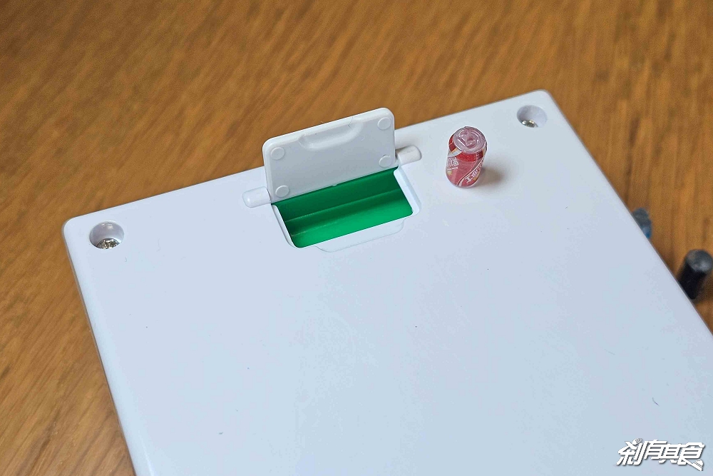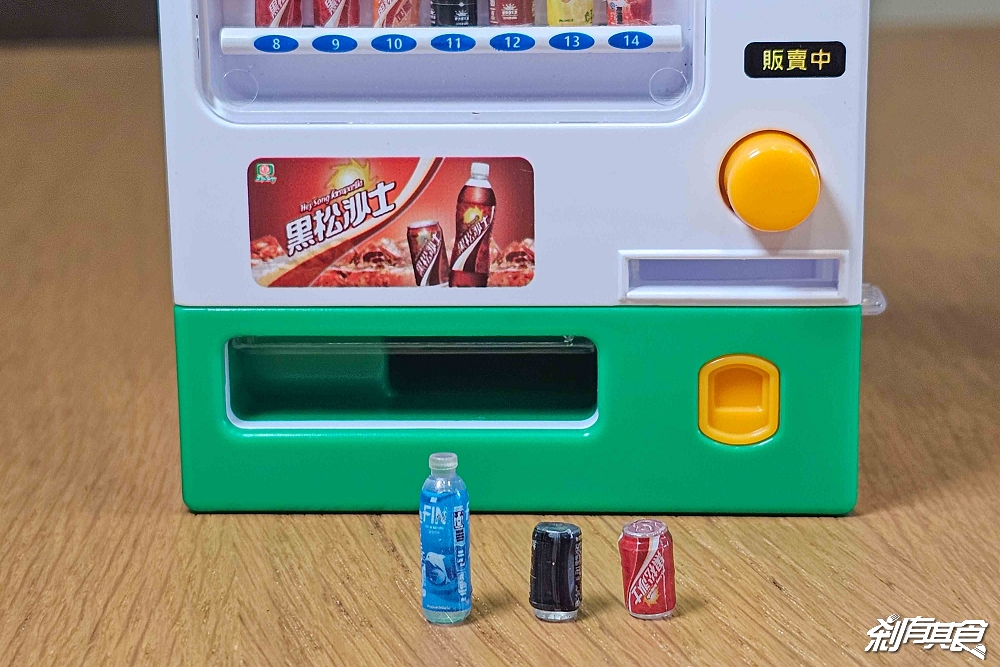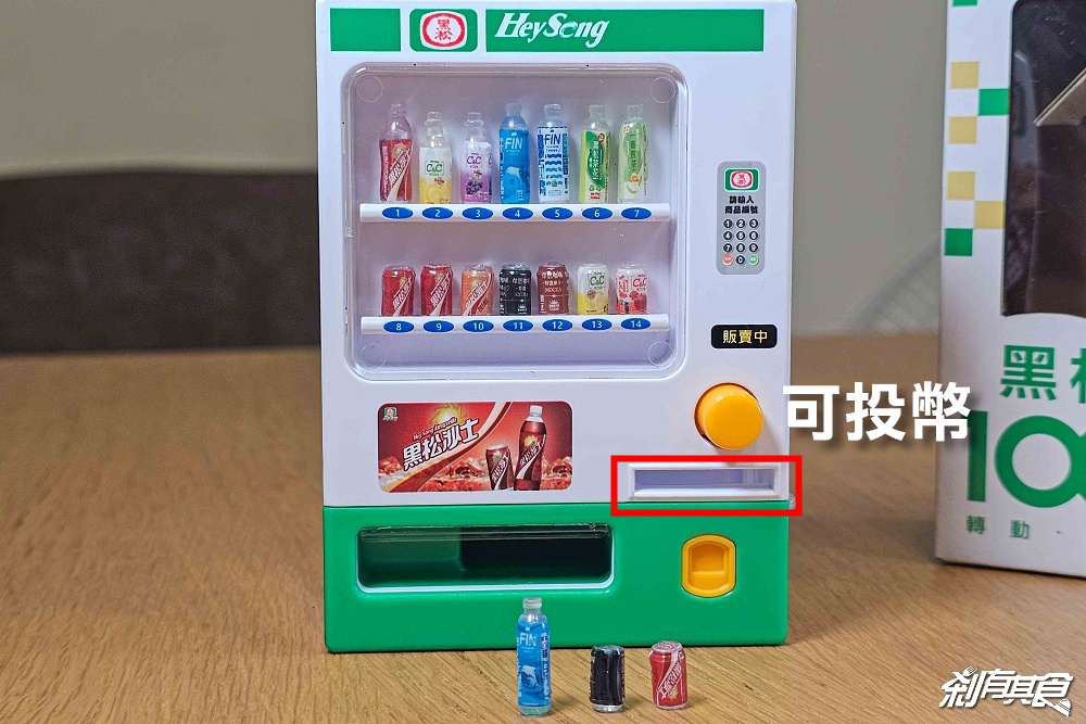 側面是投幣後的硬幣放置區,還附黑松沙士、韋恩特濃咖啡與 FIN 三款熱銷飲品的迷你瓶身,怎麼那麼古錐啦~😍