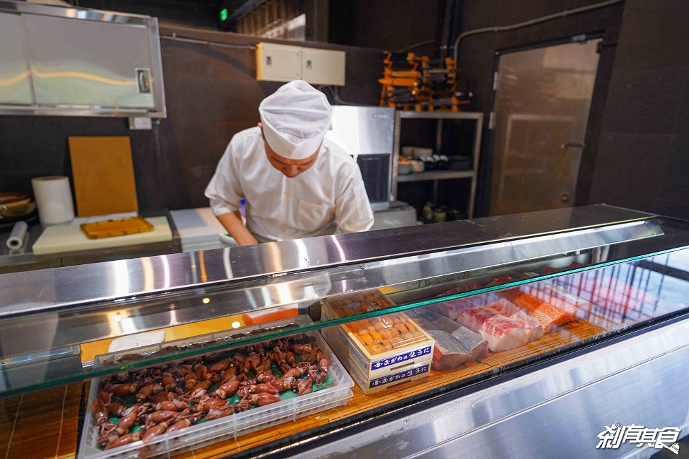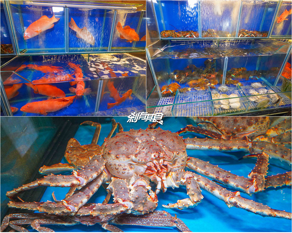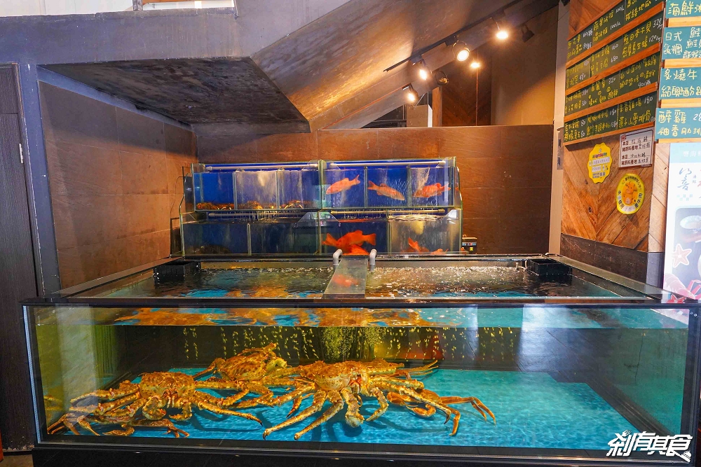 最吸睛的莫過於入口旁與用餐區一側設置的大型活體水族箱,養殖著各式各樣的活體海鮮,如帝王蟹、波士頓龍蝦、紅條等生猛海鮮,海鮮來自日本、澎湖與宜蘭龜山島等優質海域,活動力十足,讓人一看就知道食材有多新鮮。