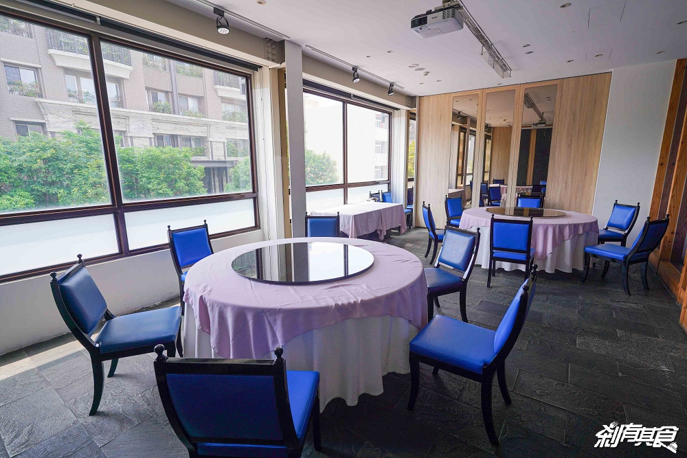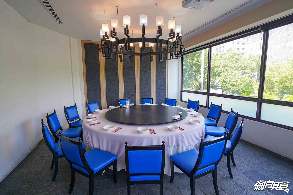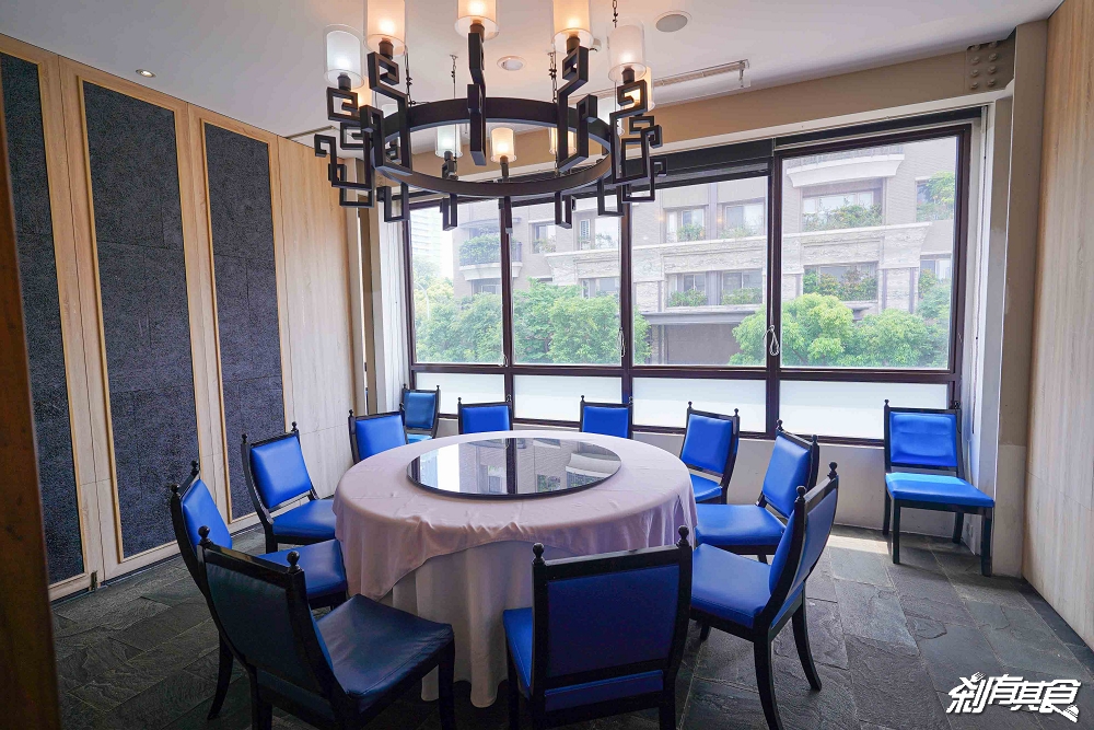 包廂區則走更為簡潔高雅的風格。以大面積落地窗引入自然光,窗外綠意盎然,營造舒適放鬆的用餐環境。圓桌搭配深藍皮椅與中式吊燈,充滿現代風格,適合家庭聚會或正式宴客,有隱密性又不失氣派👍