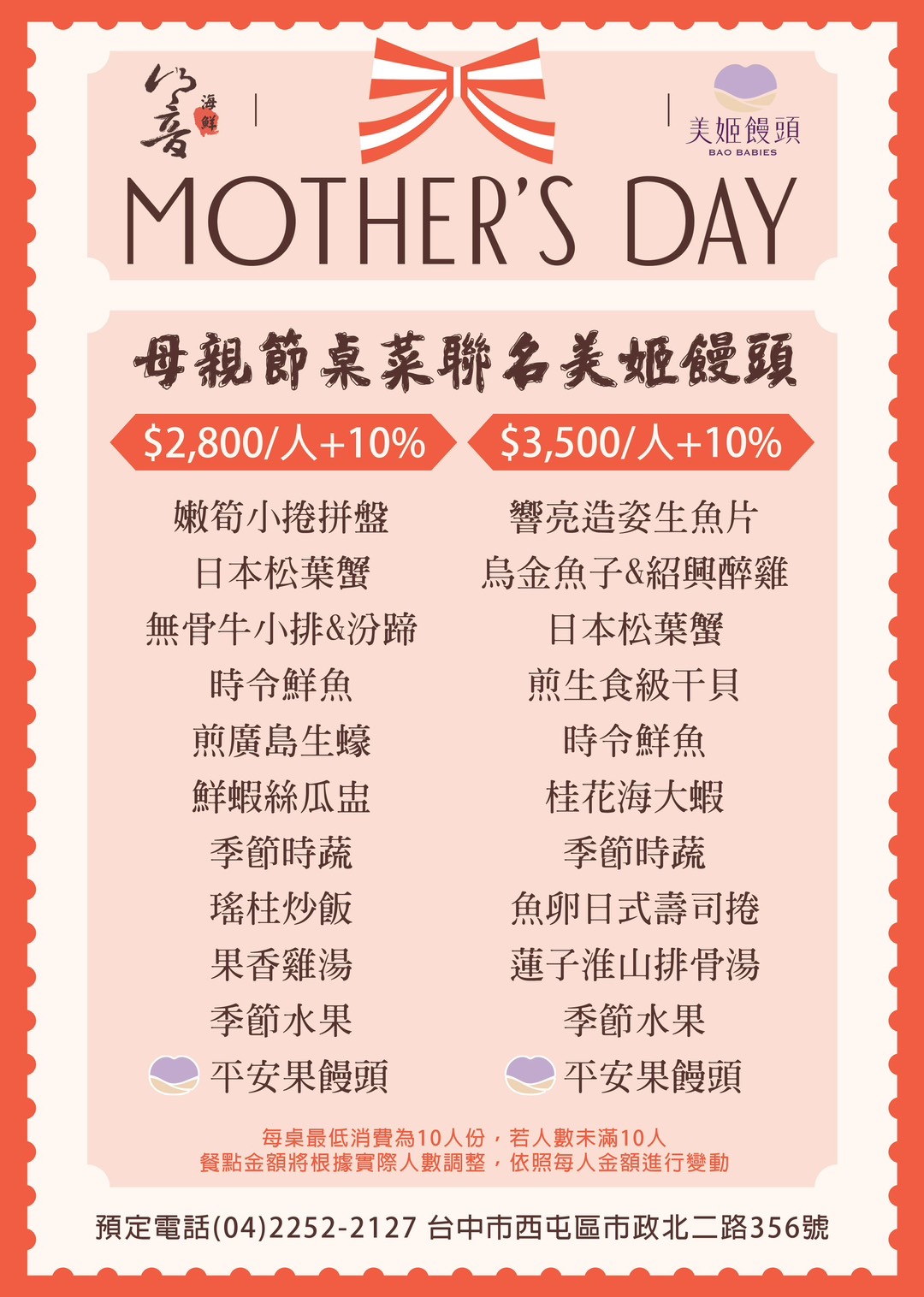 今年母親節特別聯名「美姬饅頭」推出母親節桌菜,有每人2800+10%、3500+10% 兩種不同價位,還能吃到日本松葉蟹!