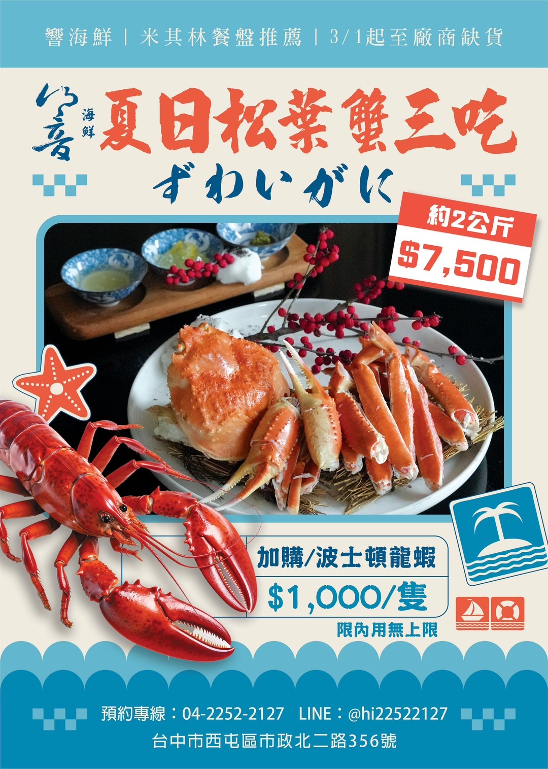 今天小剎來介紹台中米其林餐廳,「響海鮮」以提供新鮮、高品質的海鮮料理聞名,特別是他們每日從日本、澎湖及宜蘭龜山島等地進口各式活體海鮮,店內一大特色就是沒有固定菜單,可以直接在海鮮展示區挑選喜歡的漁獲,並與服務人員討論最適合的烹調方式,會根據用餐人數調整份量,無論是家庭聚餐或團體聚會都很適合。 最近推出的美姬饅頭母親節聯名桌菜,還能吃到松葉蟹、桂花海大蝦,真的很澎湃!