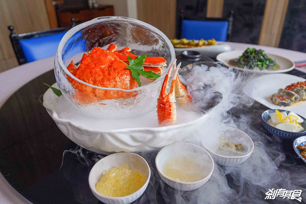 上桌時不只有噴乾冰,連放松葉蟹的透明碗其實是冰塊做的,一開場就把氣勢及儀式感拉到滿點,不愧是頂級食材啊!