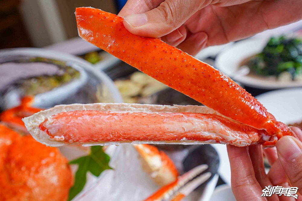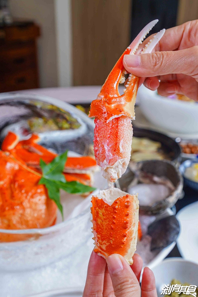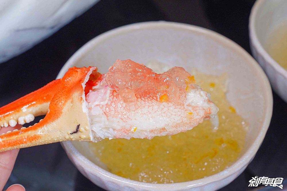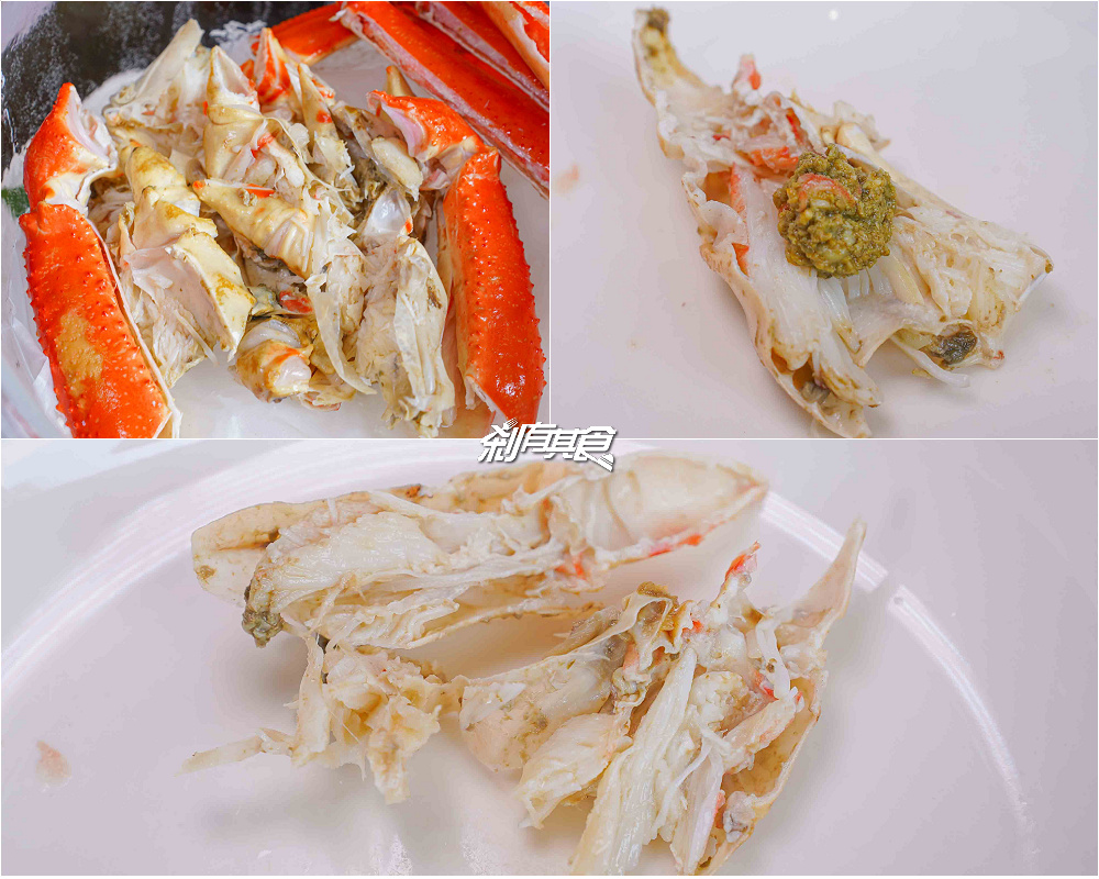 店員介紹說「松葉蟹」做法其實不簡單,要先蒸熟1小時,再進行冰鎮,因為吃起來帶點冰感,所以有些客人誤會是前一天煮好的,其實是蒸完再進行冰鎮,這樣口感更加Q彈,如果用餐人數夠多的話,還可以升級「松葉蟹三吃」。
