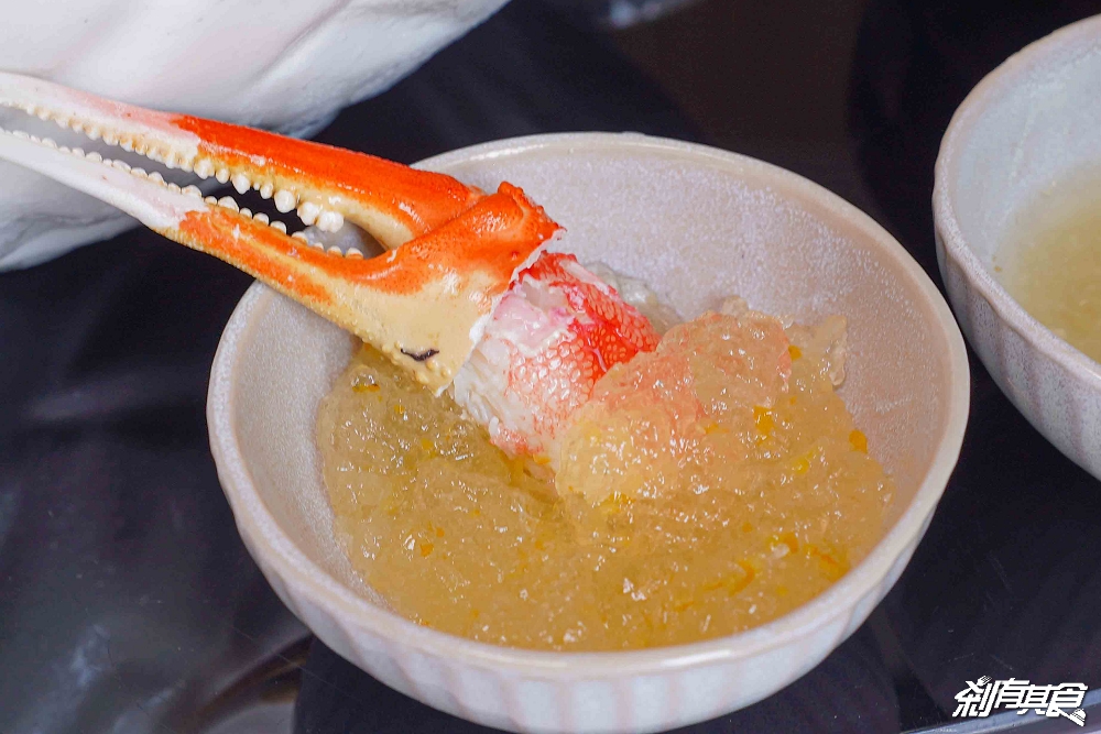 除了吃原味之外,為了搭配「松葉蟹」他們特別準備了「檸檬醋、薑醋、蟹膏」3種沾醬都好吃,大家一定都要試試,其中「檸檬醋」是有點像果凍的形式,吃起來酸酸甜甜、非常解膩!