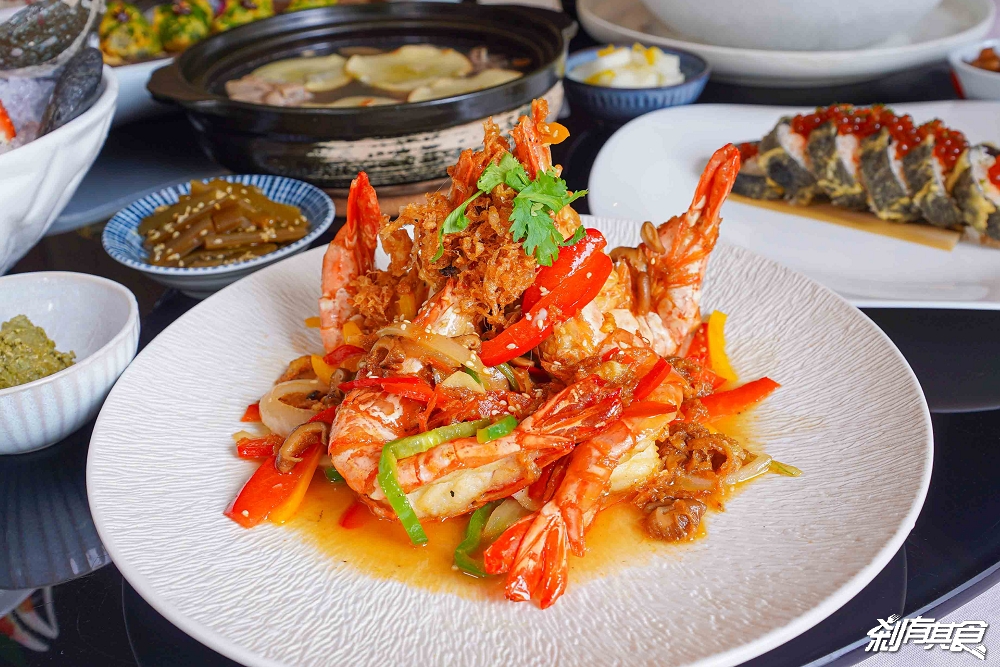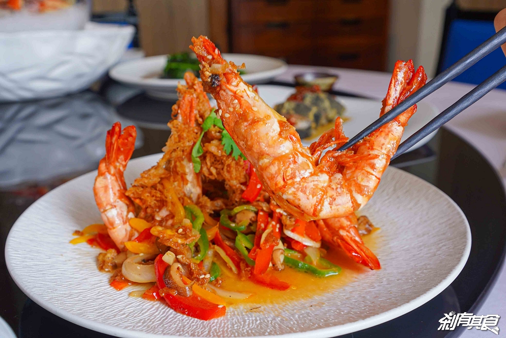 這道用了「澎湖大蝦」來製作,一般「桂花」指的是蛋液打散後下鍋快速翻炒,使其呈現細碎如桂花瓣般的質感,在這裡則是使用蛋酥來製作,讓整道菜色充滿層次感,再加入青紅雙椒配色極為好看。