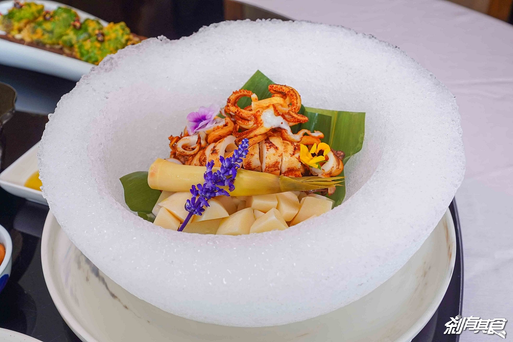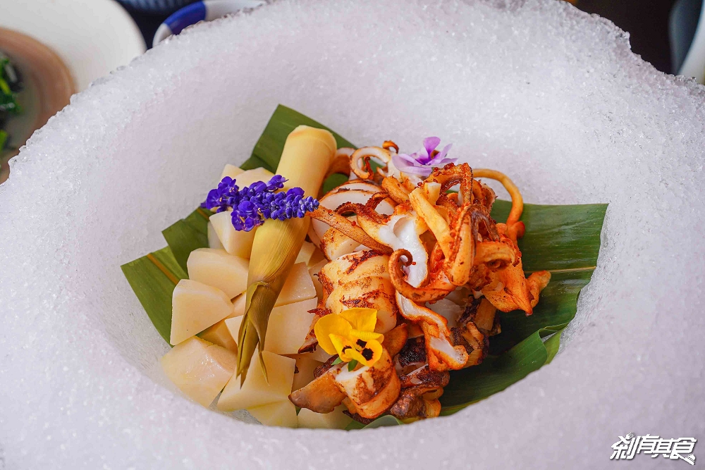 冰碗之中是「澎湖小卷、松露綠竹筍」,還用了食用花來裝飾,看起來真是美極了~