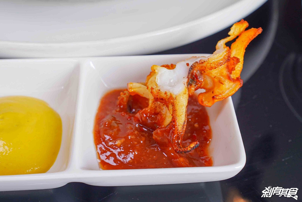 「澎湖小卷」有炭烤過,散發出迷人的香氣,第一口先單吃,吃到滿滿的海味;第二口再沾個特調五味醬來吃,酸甜微辣、香而不膩,也很好吃。
