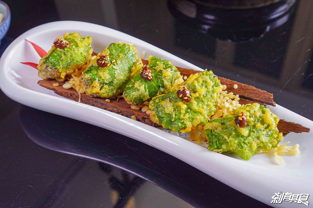 飽滿的「廣島生蠔」用紫蘇葉包覆後再去酥炸,鮮味都保留在其中,上面再點綴紅味噌來提味,是一道口感有層次、味道濃郁好吃的料理。