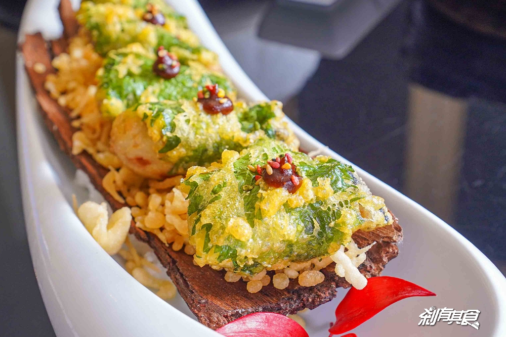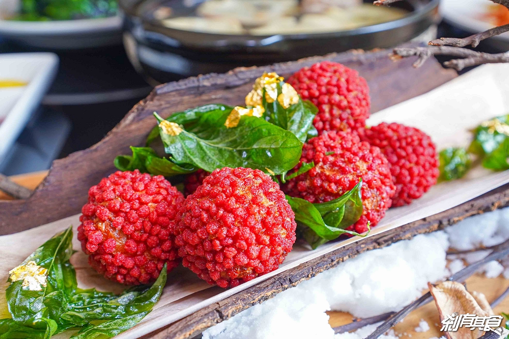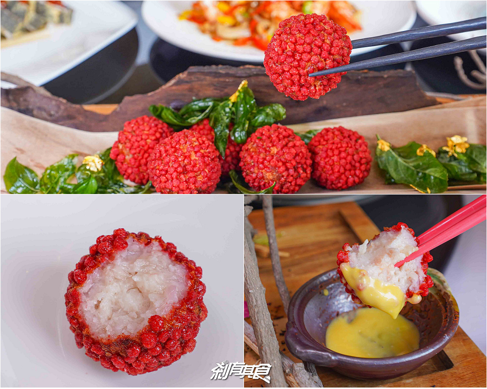 紅色外皮用了紅麴米果來模擬荔枝外皮的顆粒感,中間則是用了手打蝦漿來製作,加入九層塔一同酥炸,再放上金箔更添高級感。