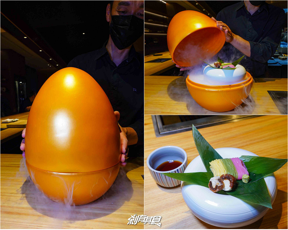 壽星禮物居然是一顆金蛋,打開時還噴出乾冰,裡面是祝壽的三色素麵及起司柿餅,素麵口感非常滑順且Q彈,本身味道清淡可搭配醬汁一起吃。