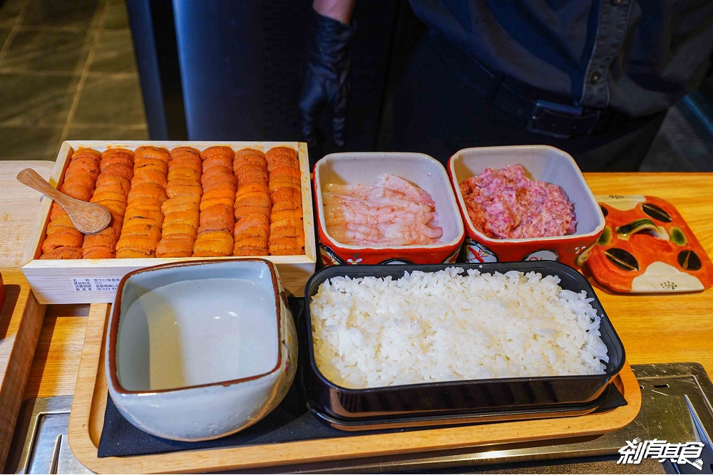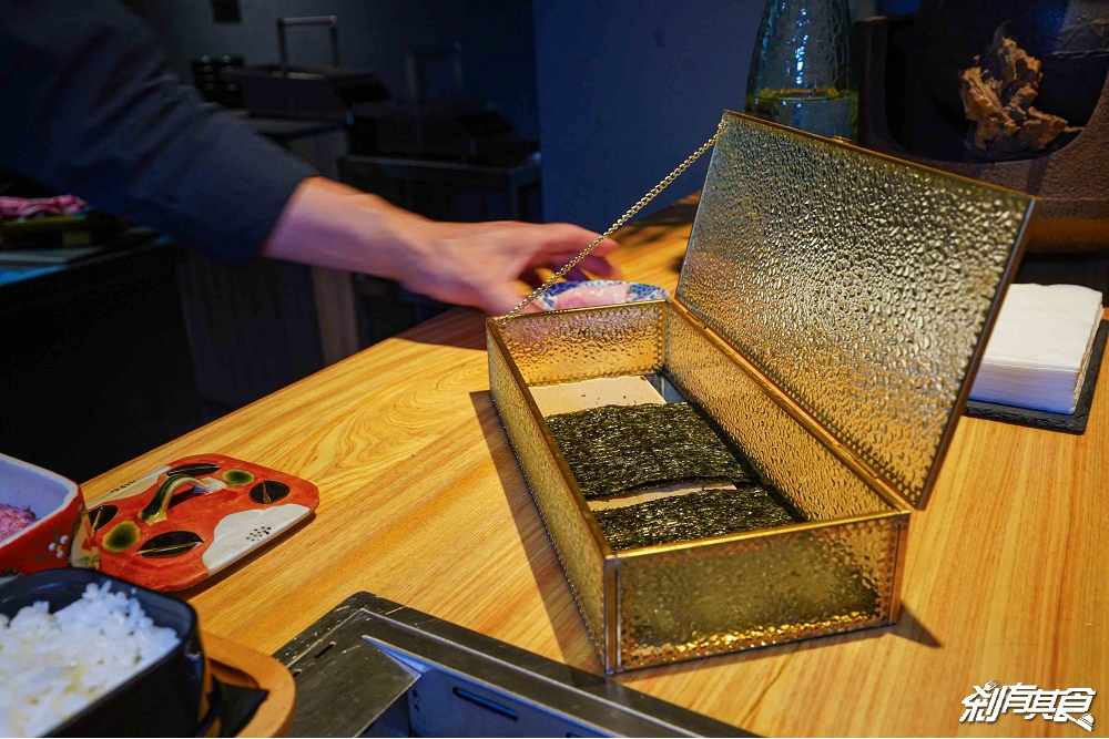接著師傅又拿出海膽、甜蝦、生牛肉、醋飯等食材準備製作「牛肉海膽握壽司」,海苔還是放在玻璃盒裡面,接著開始製作,滿滿儀式感讓人越來越期待,這也是板前燒肉的魅力之一。