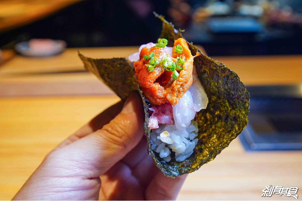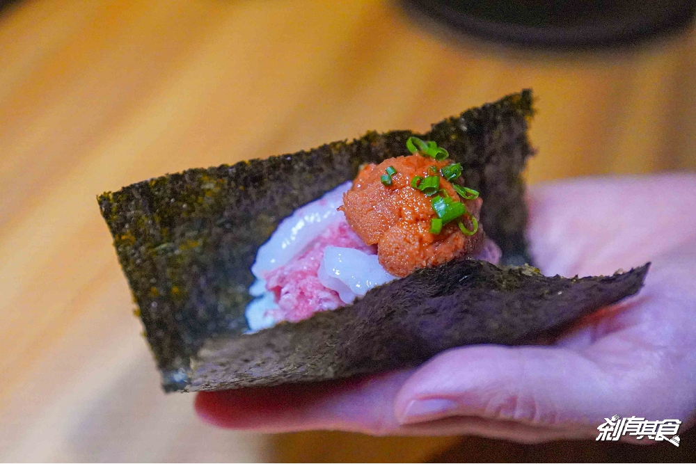 「牛肉海膽握壽司」裡面其實還有甜蝦,今天的「海膽 (生うに)」是來自北海道有名的石田商店,他們家的馬糞海膽有一定的水準!吃起來超級鮮甜,而且完全沒有藥水味,搭配甜蝦、生牛肉、醋飯及爽脆的海苔真的超讚,最佳賞味期很短,一定盡快吃完~