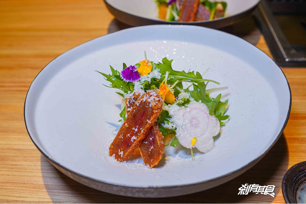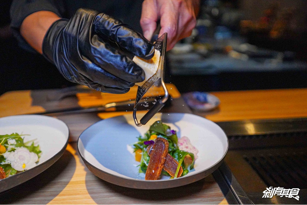 好美的一道沙拉就在我們面前製作,烤過的雲林優質烏魚子佐上生菜、溫泉蛋、季節水果、食用花,還現刨起司,是我吃過最美、最好吃的烏魚子吃法👍
