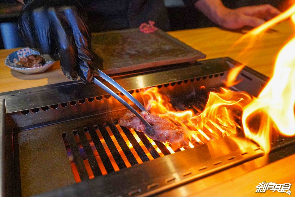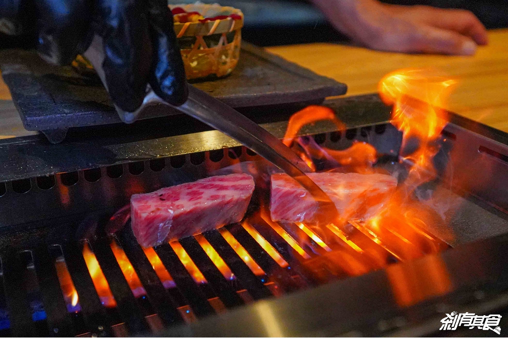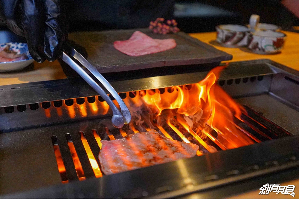 接著師傅開始為我們烤肉,一放上450度高溫的鐵板滋滋作響,發出迷人的香味,冒出的火焰也很誘人,師傅說每個部位有不同的烤法及適合的熟度,你可以 “お任せ OMAKASE” 全交給師傅決定,也可以提出自己喜好。