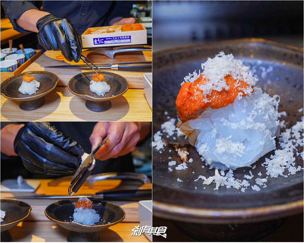 澎湖的軟絲以其新鮮度和優良的肉質聞名,口感Q彈有嚼勁,且帶有天然的鮮甜,每一口都彷彿能感受到海洋的氣息,海膽如同奶油般綿密滑順,入口即化,在舌尖留下濃郁的鮮甜,上面現刨開心果讓香氣更加充盈,兩者合一可說是鮮上加鮮,鮮到一個不行啊!