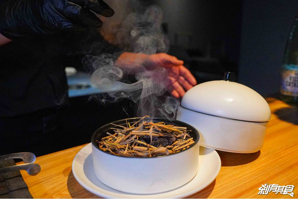 經過火烤、稻草煙燻的牛小排風味更上一層,外層呈現誘人的焦糖色,甚至帶有微微的炭烤痕跡,吃起來會有一點點酥香的口感,與內部的軟嫩形成對比,入口後油脂會在舌尖上緩緩融化,帶來滑順、豐腴的口感,並散發出濃郁的油脂香氣,與稻草的清香交織在一起,非常迷人。