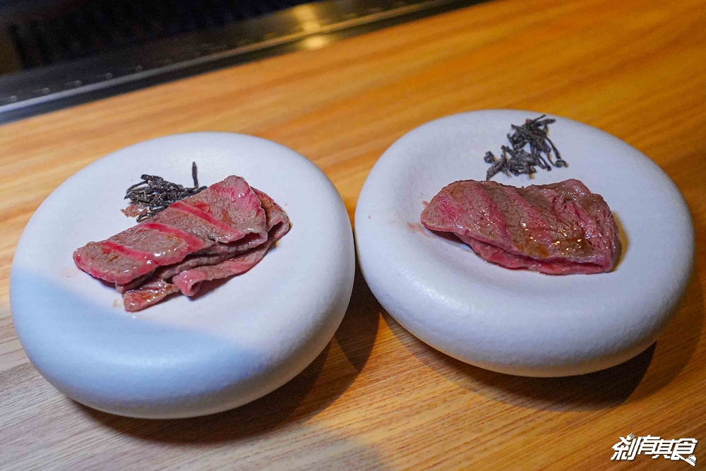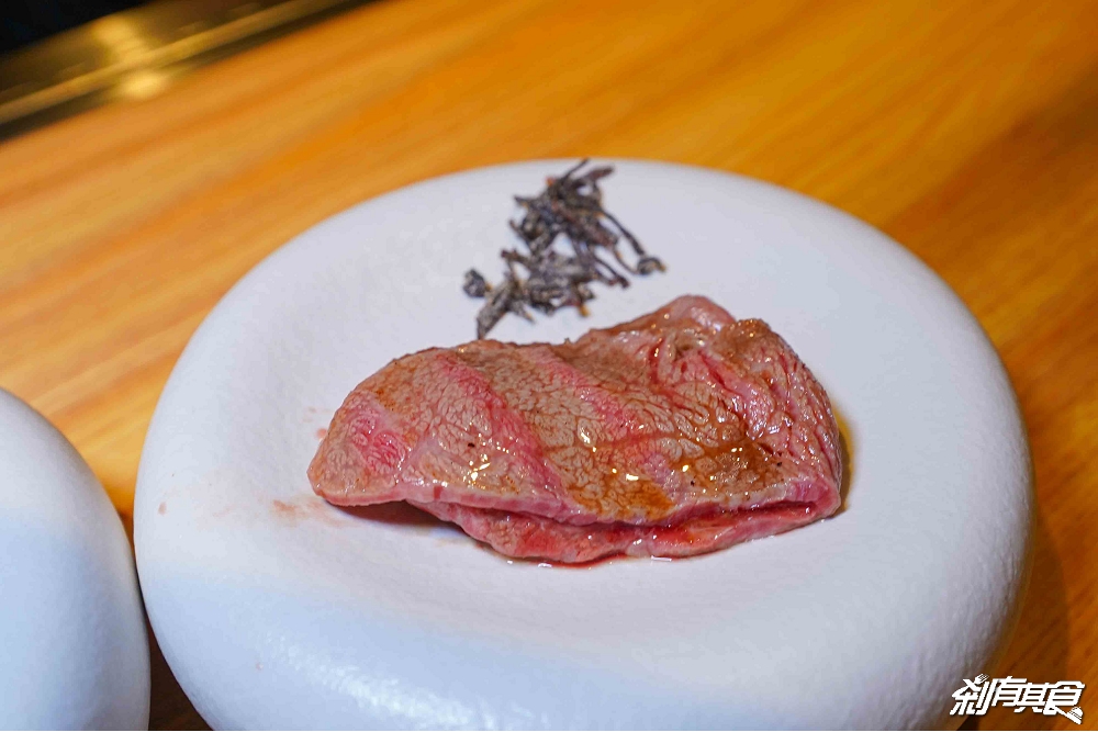 脂肪含量較少,口感相對柔嫩,但仍帶有牛肉的紮實感和細緻肌肉纖維,由於脂肪少,口感較為清爽,能品嚐到純粹的牛肉風味,旁邊是菠菜小魚及昆布鹽。