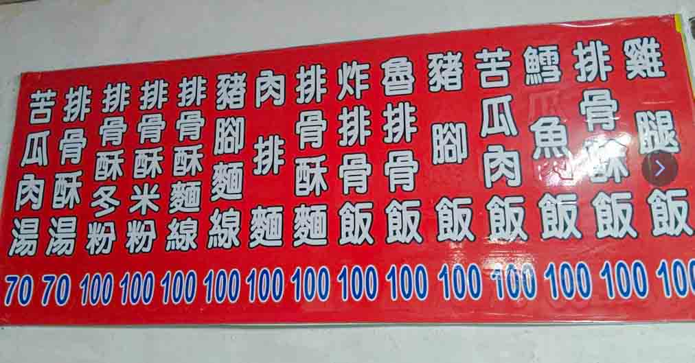 便當有雞腿飯、排骨酥飯、苦瓜肉飯、炸排骨飯…等,麵類有肉排麵、排骨酥麵…等,都是100元。