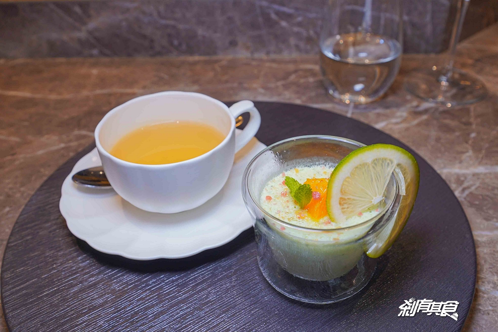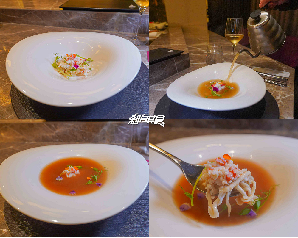 起手式先來碗帝王蟹湯,師傅說這道湯品是以「普羅旺斯海鮮湯」為發想,裡面有帝王蟹、珊瑚菇、筍丁、番茄等,湯頭是以番茄與蟹熬煮而成,融合帝王蟹肉及菇類的鮮甜,喝起來鮮美好喝。