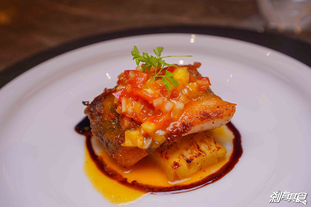 再來師傅用橄欖油香煎比目魚,外皮煎至金黃香酥,帶點焦香的酥脆感,口感帶有淡淡的鮮甜,再淋上芒果莎莎醬,吃起來酸酸甜甜,口感更有層次,底下還有一塊煎過的奶油鳳梨,更有夏季熱帶氣息。