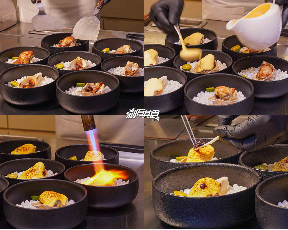 日本播磨生蠔煎好之後擺盤,淋上師傅特製的海膽荷蘭醬,並進行炙燒,最後再放上魚子醬,工序真的很多,這就是「樂葵法式鐵板燒」最大的特色所在,把法式料理的精神融入鐵板燒中,就好像在吃一道道Fine Dining一樣,讓人很期待下一道菜又帶來哪些驚喜。