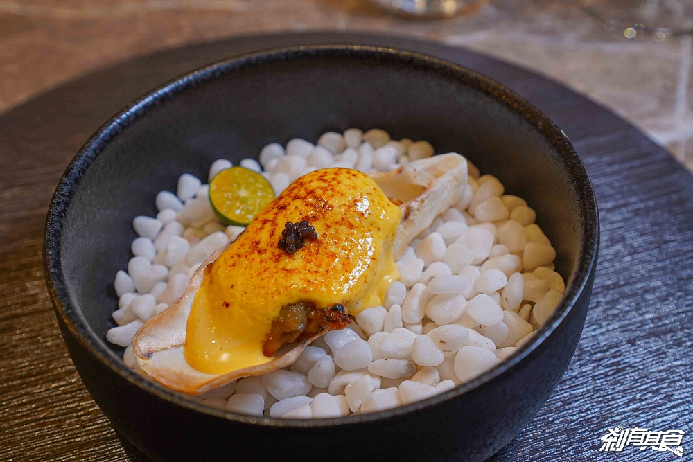 擺盤底下還鋪上石子,彷彿來到熱帶沙灘,香煎牡蠣上面的就是「海膽荷蘭醬」,這種醬我第一次吃到,是在經典的法式荷蘭醬的基礎上,加入了海膽的元素,海膽帶來了其特有的鮮甜、略帶鹹味和海洋的風味,上面點綴魚子醬,整體吃起來更加鮮美濃郁,好好吃喔~ 連底下的鐵板蕈菇也很好吃,好吃到差點想舔盤子了😆