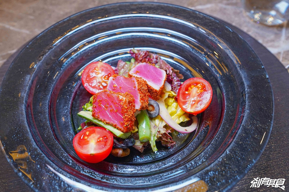 尼斯沙拉是法國的經典菜,在法國小餐館的菜單上常常可以見到這道菜,師傅以其為發想做出這道「金槍魚的夏日漫步.藜麥紅酒油醋沙拉」。