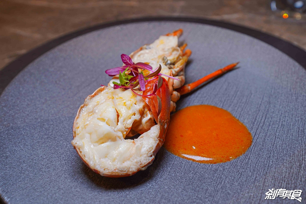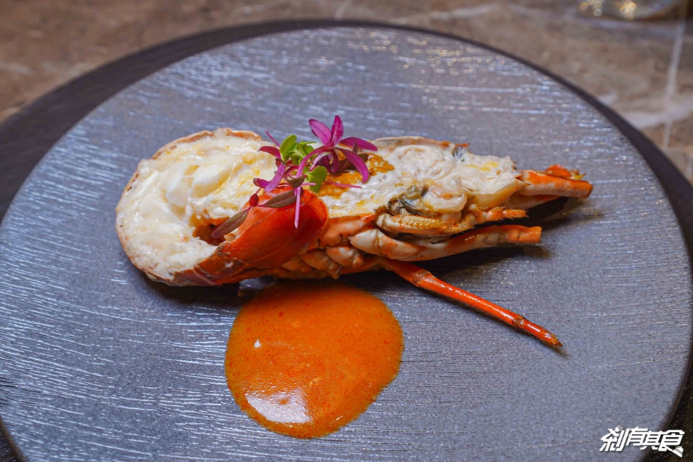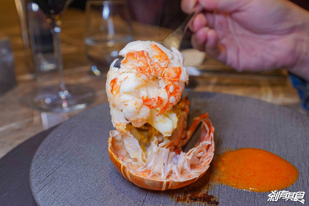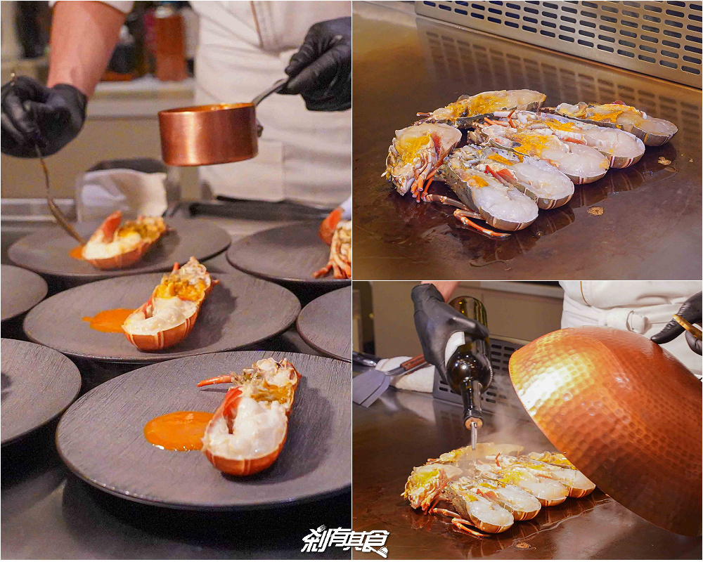 選用南美竹龍蝦來製作,竹龍蝦的肉質帶有自然的鮮甜味,質地柔軟但不失彈性,非常適合清蒸食用,所以師傅只有淋上白酒之後就蓋上蓋子,利用鐵板高溫蒸發的酒氣、水氣把龍蝦蒸熟。
