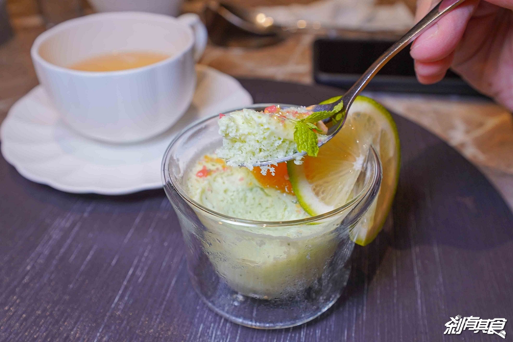 手工雪酪結合新鮮萊姆與薄荷,帶微醺白蘭姆酒香,入口冰涼爽口還有跳跳糖的彈跳口感,好吃又解膩!