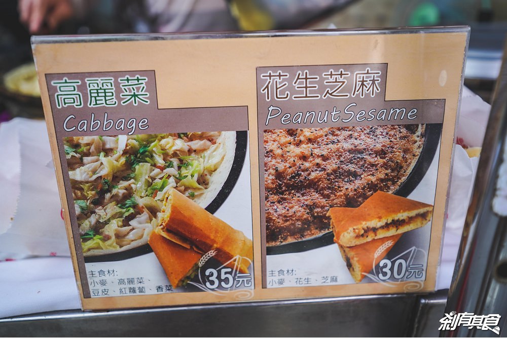 「順口香麥仔煎」平日只有2種口味,高麗菜 40元、花生芝麻 30元,假日會有紅豆口味 30元,都是素食可以吃的喔~